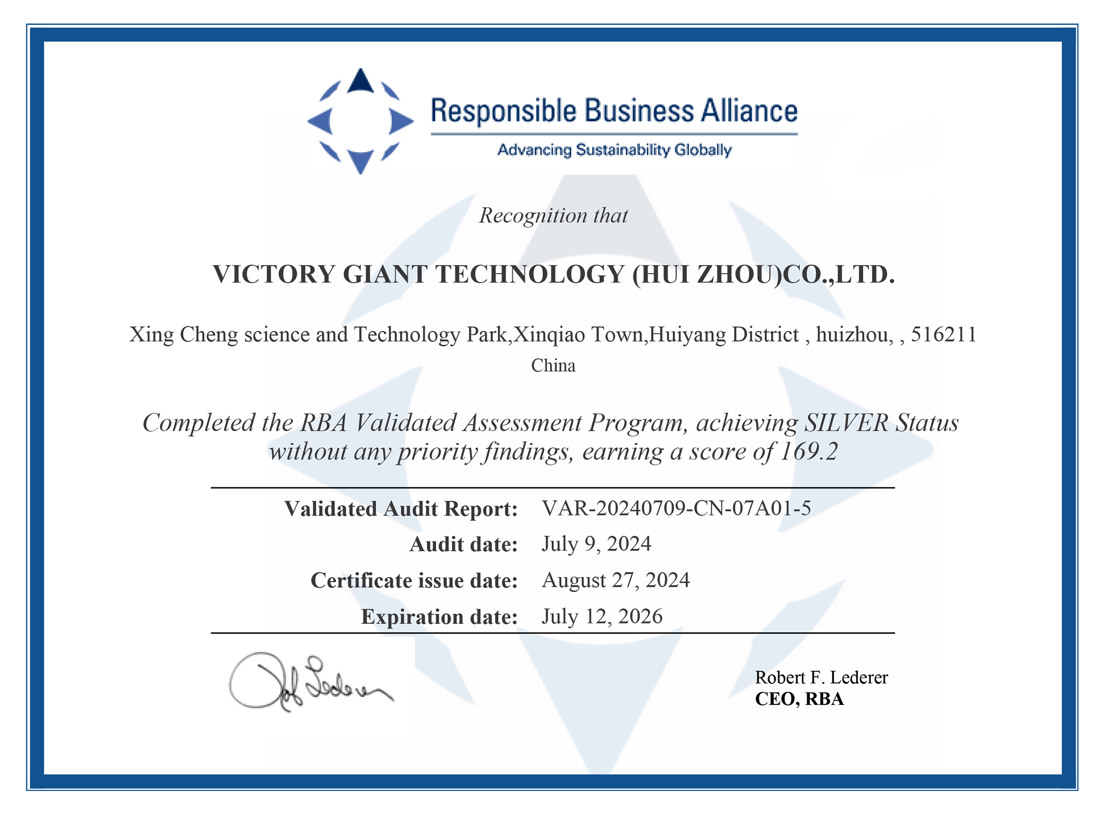 RBA VAP 社會責(zé)任審核證書